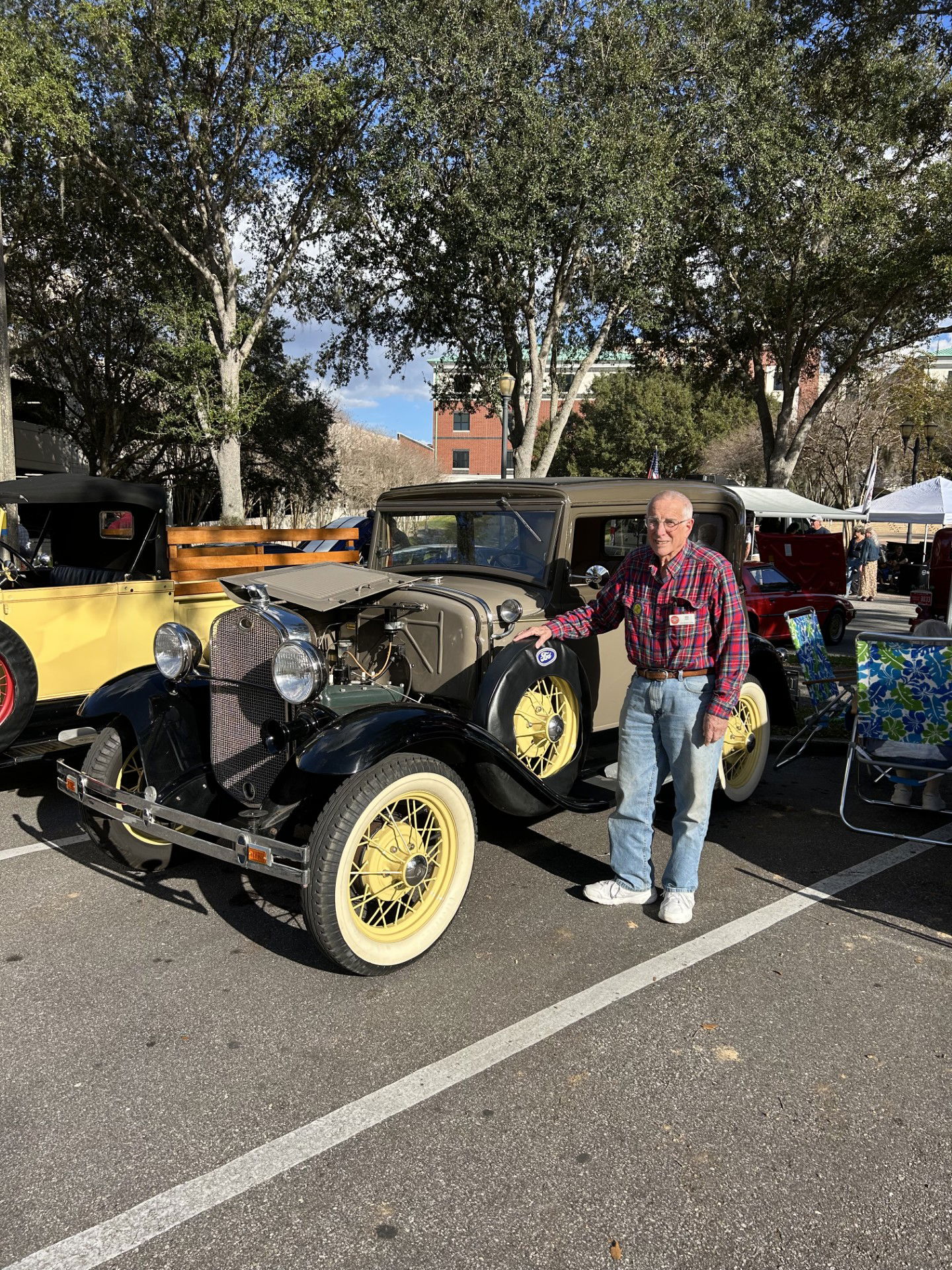 One day when my coupe didn't want to start a neighbor suggested I contact the local NAPA store in Bunnell. They provided the number for Warren Schmidt, a member of the Crankin A's. Warren had my car going in about 20 minutes - yes, it was the condensor! He invited me to join the club. He also became my adopted dad. 2 years later he nominated me for club president (2020 - 2021, The Covid Years). Within 2 months we were shut down. To keep the club together I started having meetings outdoors at Lake Diaz, 6 ft apart, etc. During that time, we began talks with the Pioneer Settlement (Thanks to Fred Clark and Harvey Willis) and Herman's Garage started to happen. The coupe was now running well, and I decided to add a 1930 Tudor "Odie" to my family. So, after 4 years (and 2 great presidents, Kim Ziffra and Paul Howes) I am happy to be back as president! ~Bruce Hawley~